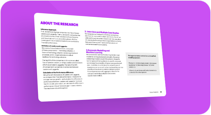 ABOUT THE RESEARCH Inference Approach 2. Interviews and Multiple Case Studies First, we define and group companies into Future System We triangulate our findings from the large-scale primary Leaders and Laggards. That is, we identify companies that data from the survey with multiple case studies. Overall, we are ahead in terms of their evolution to Future Systems collected through secondary research and interviews about and those that aren’t, or, are evolving slowly. We then 30 case studies focusing on issues organizations are facing investigate if Future Systems leadership is correlated to because of their current IT stack and the evolution of financial performance. companies toward Future Systems. Definition of Leaders and Laggards: We create a Future Systems Score, composed 3.Economic Modelling and of three components: 1. Technology adoption. 2. Machine Learning Extent of technology adoption across organizational We use economic and machine learning (decision tree) processes, and 3. Organizational and cultural The regression below summarizes our (simplified) readiness for technology adoption. models for arriving at prescriptive insights. We used an modelling approach: ordered logit model to study if the adoption of specific The top 10% of the companies on this score we called technologies and their application to specific processes Future Systems Leaders, or simply Leaders and the bottom can increase the probability of higher revenue and growth Revenue= α + β *technologies adopted + β *processes 1 2 25% (Future System) Laggards. The rest of the 65% rates. In addition, to understand the cultural factors of transformed + β *technology*process + β *control 3 4 of companies in our sample sit somewhere between importance, we ran a machine learning based decision tree variables +μ Leaders and Laggards. classifier and explored correlations between Leaders’ Where, β - β are the key coefficients of interest and μ Calculation of the Performance difference Future Systems score with aggregate indices for the 1 3 company’s technology adoption and process is the error term of the regression Using the definitions above of Leaders and Laggards, transformation indices. we compare their financial performance—measured by average revenue growth—and calculate the difference in performance between Leaders and Laggards. To ensure that the results were robust, we calculate the difference in performance—the performance gap—in every industry. The results are robust throughout. Future Systems 28