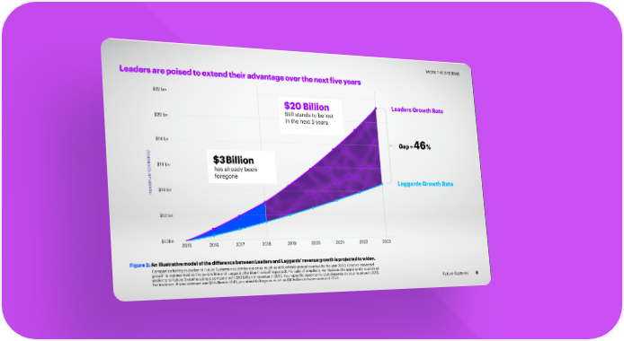 WORK THE SYSTEMS Leaders are poised to extend their advantage over the next five years $22 bn Leaders Growth Rate $20 Billion Still stands to be lost $20 bn in the next 5 years $18 bn Gap = 46% $16 bn $3Billi on has already been foregone Laggards Growth Rate Revenue (billions)$14 bn $12 bn $10bn 2015 2016 2017 2018 2019 2020 2021 2022 2023 Figure 2: An illustrative model of the difference between Leaders and Laggards’ revenue growth is projected to widen. Companies failing to evolve to Future Systems could miss out on as much as 46% of their annual revenue by the year 2023. Leaders’ expected growth is represented by the purple line and Laggards the blue line (self-reported). For sake of simplicity, we illustrate the opportunity cost of not evolving to Future Systems using a company with $10 billion in revenue in 2015. Your specific opportunity cost depends on your revenue in 2015. For instance, if your revenue was $5 billion in 2015, you stand to forgo as much as $10 billion between now and 2023. Future Systems 8