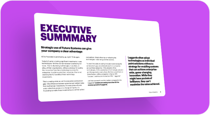 EXECUTIVE SUMMMARY Strategic use of Future Systems can give your company a clear advantage 80% of success is just showing up, right? Think again. competitors. Simply showing up—adopting the Laggards often adopt technologies—does not guarantee success. technologies as individual Today’s C-suite is making significant investments in new technologies. Yet they are not necessarily achieving full To crack the code on scaling innovation and closing the point solutions without a value. They’re deploying technologies in pockets, or achievement gap, we collected data from companies strategy for enabling systems silos, of their organizations, without a strategy for scaling across three categories: 1) the adoption of key the innovation from these technologies across the technologies, 2) the penetration of technologies adopted that can achieve enterprise- enterprise. Unable to scale their innovation, they’re not and 3) organization and culture. We then scored them on wide, game-changing realizing the full benefits of their technology these factors, calling companies in the top 10% investments. “Leaders,” and those in the bottom 25%, “Laggards.” innovation. While they This is creating what we call the innovation achievement Just how successful are the Leaders compared to the might have pockets of gap—the difference between potential and realized value Laggards? Leaders are seeing more than 2X the brilliance, they can’t from technology investments. For executives who are revenue growth of Laggards. maximize the value achieved. under relentless pressure to change and grow, it’s frustrating to make these investments and still fall behind Future Systems 3