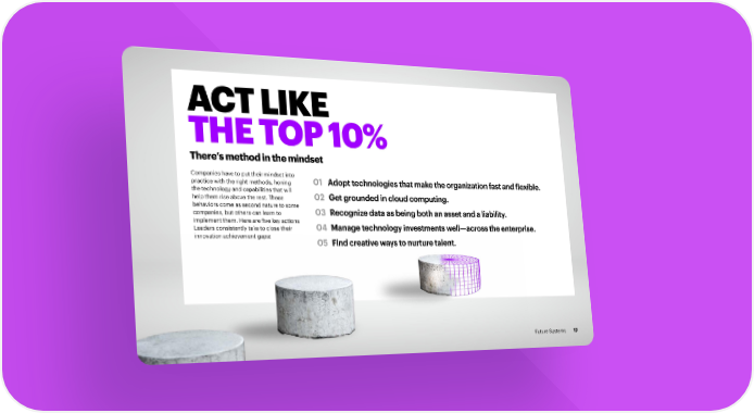 ACT LIKE THE TOP 10% There’s method in the mindset Companies have to put their mindset into practice with the right methods, honing 01 Adopt technologies that make the organization fast and flexible. the technology and capabilities that will help them rise above the rest. These 02 Get grounded in cloud computing. behaviors come as second nature to some companies, but others can learn to 03 R ecognize data as being both an asset and a liability. implement them. Here are five key actions Leaders consistently take to close their 04 Manage technology investments well—across the enterprise. innovation achievement gaps: 05 Find creative ways to nurture talent. Future Systems 17