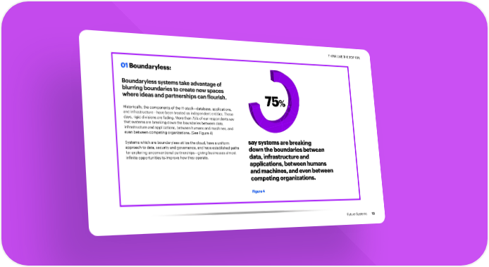 THINK LIKE THE TOP 10% 01 Boundaryless: Boundaryless systems take advantage of blurring boundaries to create new spaces where ideas and partnerships can flourish. 75% Historically, the components of the IT-stack—database, applications, and infrastructure—have been treated as independent entities. These days, rigid divisions are fading. More than 75% of our respondents say that systems are breaking down the boundaries between data, infrastructure and applications, between humans and machines, and even between competing organizations. (See Figure 4) Systems which are boundaryless utilize the cloud, have a uniform say systems are breaking approach to data, security and governance, and have established paths down the boundaries between for exploring unconventional partnerships—giving businesses almost infinite opportunities to improve how they operate. data, infrastructure and applications, between humans and machines, and even between competing organizations. Figure 4 Future Systems 13