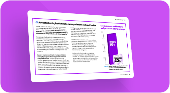 ACT LIKE THE TOP 10% 01 Adopt technologies that make the organization fast and flexible Leaders create architectures Leaders are moving to decoupled data, infrastructure Even digital native companies are faced with the need and processes built for change and applications that enable greater flexibility and a to update monolithic enterprise architectures. When 100 faster-moving IT culture. Eighty-three percent of them one travel industry disruptor first launched their agree that it’s important to decouple data from legacy business just over a decade ago, speed to market was infrastructure, compared with only 37% of Laggards. paramount, so getting the right long-term, scalable architecture in place wasn’t a priority. 80 Laggards are also far behind in the adoption of DevOps, automation and continuous integration/continuous Then the company faced the challenge of scaling its deployment, with a 29% adoption rate compared with 98% platform to meet the demands of a growing customer LEADERS of Leaders. All of these technologies and approaches are base and geographic expansion. As part of a 60 97% designed to help companies eliminate dependencies in their decoupling initiative, it migrated its platform to systems and processes, which in turn makes them more microservices, which allows the company to rapidly agile. Across the world, companies cite architecture flexibility respond to change and add new features as it as one of the biggest barriers to innovating at scale. (See experiences explosive growth. 40 Figure 13) Leaders opt for flexible, uniform and scalable Leaders’ adoption of critical technologies that allow architectures capable of responding to market decoupling outpaces that of Laggards by a massive demands, like seamless customer payments. Laggards, 20 margin: 97% to 30%. These technologies include on the other hand, find it difficult to move away from LAGGARDS microservice architectures (enabled by a suite of tools that rigid IT architectures, which leaves them unable to break applications into simple, discrete services), containers maximize investments in innovation. 30% (a way to package an application so it can be run in isolation from other processes) and Kubernetes (an open-source 0 container-orchestration system for automating application Figure 8: Leaders’ adoption of critical technologies deployment, scaling and management). (See Figure 8) that allow decoupling outpaces that of Laggards by a massive margin. Future Systems 18