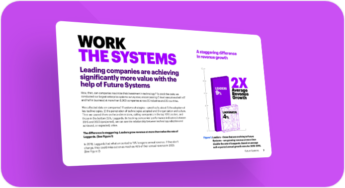 WORK A staggering difference THE SYSTEMS in revenue growth Leading companies are achieving 10 8 significantly more value with the help of Future Systems LEADERS How, then, can companies maximize their investment in technology? To crack the code, we 6 9% conducted our largest enterprise systems survey ever, encompassing C-level executives (half in IT and half in business) at more than 8,300 companies across 20 industries and 20 countries. 4 We collected data on companies’ IT systems strategies—specifically, about 1) the adoption of key technologies, 2) the penetration of technologies adopted and 3) organization and culture. LAGGARDS Then we scored them on these dimensions, calling companies in the top 10% Leaders, and those in the bottom 25%, Laggards. By tracking companies’ performance indicators between 2 4% 2015 and 2023 (projected), we can see the relationship between technology adoption and achieved, or expected, value. The difference is staggering: Leaders grow revenue at more than twice the rate of 0 Laggards. (See Figure 1) Figure 1: Leaders—those that are evolving to Future In 2018, Laggards had what amounted to 15% foregone annual revenue. If they don’t Systems—are growing revenue at more than change, they could miss out on as much as 46% of their annual revenue in 2023. double the rate of Laggards. Based on average (See Figure 2) self-reported annual growth rates for 2015-2018. Future Systems 7