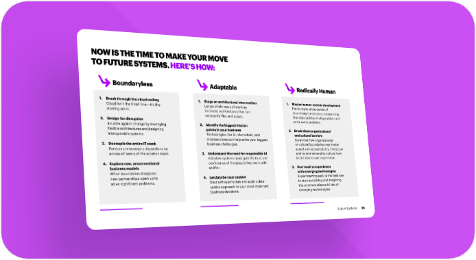 NOW IS THE TIME TO MAKE YOUR MOVE TO FUTURE SYSTEMS. HERE’S HOW: Boundaryless Adaptable Radically Human 1. Break through the cloud ceiling 1. S tage an architectural intervention 1. Master human-centric development Cloud isn’t the finish line—it’s the Let go of old ways of working Put humans at the center of starting point. to create architectures that can your design processes, recognizing constantly flex and adapt. that data and technology alone can’t 2. Design for disruption solve every problem. Insulate against change by leveraging 2. Identify the biggest friction flexible architectures and designing points in your business 2. Break down organizational interoperable systems. Technologies like AI, blockchain, and and cultural barriers microservices can help solve your biggest Scrutinize how organizational 3. Decouple the entire IT stack business challenges. or cultural boundaries may hinder Remove unnecessary dependencies speed and accountability. Embed an across all layers of the solution stack. 3. U nderstand the need for responsible AI end-to-end ownership culture from Adaptive systems must gain the trust and initial idea to user experience. 4. Explore new, unconventional confidence of the people they work with business models and for. 3. Don’t wait to experiment When boundaries disappear, with emerging technologies new partnerships open up to 4. Let data be your captain Experimenting early is the best way solve significant problems. Start with quality data and apply a data- to start socializing and imagining centric approach to your most important the commercial possibilities of business decisions. emerging technologies. Future Systems 26