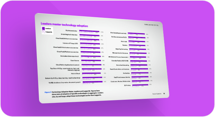 THINK LIKE THE TOP 10% Leaders master technology adoption Leaders Big data analytics 100% Distributed logs/event hubs 96% 68% 30% Laggards 98% Streaming/real-time data 59% 99% DevOps automation/CI/CD 29% Cloud SaaS/Software as a service 97% Blockchain 94% 59% 34% Internet of Things (IOT) 99% Robotics 93% 54% 41% Cloud IaaS/Infrastructure as a service 97% Edge/Fog Computing 95% 52% 32% Cloud PaaS/Platform as a service 97% Microservice Architectures 97% 51% 27% Data Lakes (data repository) 98% RPA (Robotic Process Automation) 92% 50% 36% Open Source 98% Extended Reality (AR/VR/MR) 95% 46% 32% Cloud Native Applications (custom) 98% Serverless Computing 94% 41% 31% Top-Down AI (E.g. expert systems, logic and 98% React/Event-driven architectures 97% inference engines) 42% 25% 97% Hybrid Cloud 48% 92% DevSecOps 27% Bottom-Up AI (E.g. deep learning, machine learning) 98% FaaS/Functions as a Service 25% 95% 41% NoSQL databases (key-value, document, graph) 98% Containers, Docker, & Kubernetes 96% 35% 25% 3D Printing 90% 37% Figure 7: Technology Adoption Rates, Leaders and Laggards. Figures here show rates of adoption of specific technologies in aggregate. Leaders also, by and large, adopt these technologies earlier than Laggards. Future Systems 16