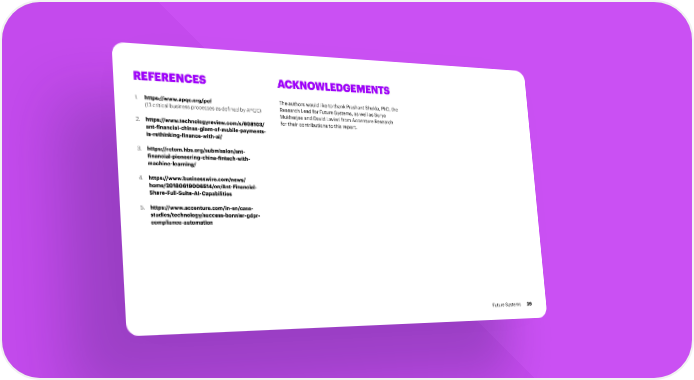A C R K EF N ER O EN W L C ED ES G EM EN T S The aut hors w ould lik e t o t hank Prashan t Shukla, PhD , t 1. h he ttps : / / www .apqc . o r g / pcf R esear ch Lead f or F ut ur e Syst ems, as w ell as Sury a ( 13 cr it ical business pr ocesses as defined b y APQC ) Mukher jee and Da vid La vier i fr om Accen t ur e R esear ch f or t hei r con t r i bu t i ons t o t h is r 2. h eport. ttps : / / www . t echno l og y r e v i e w . co m / s / 60 8 1 0 3 / an t - fi nanc i a l -ch i nas-g i an t -o f -m o b i l e-pa y m en ts- i s-r e th i n k i n g - fi n a n ce- w i th- a i / 3. h ttps : / / r ct o m. hbs. o r g / su bm issi o n / an t - financ ial-pi oneer ing-china- fin t ech- w i th- machine-lear ning / 4. h ttps : / / www . busi ness w i r e . co m / ne w s / ho me / 20 1806 190065 1 4 / en / A n t -F i nanc i a l - Share-F ull-Suit e- A I-Capabilities 5. h tt ps : / / www .a ccen t u r e . co m / i n-en / case- s t ud i es / t echno l og y / su ccess-bo nn i er -gd pr - co mpl i ance- a u t o ma t i o n Future Systems 29