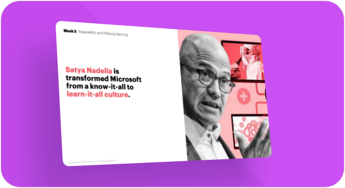 Block 2 Adaptability and lifelong learning Satya Nadella is transformed Microsoft from a know-it-all to learn-it-all culture. Copyright © 2020 Accenture. All rightsreserved.