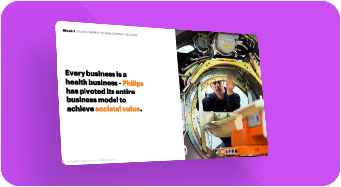 Block 1 Shared leadership and common purpose Every business is a health business -Philips has pivoted its entire business model to achieve societal value. Source: Business Insider 31.10.2019 8 Copyright © 2020 Accenture. All rightsreserved.