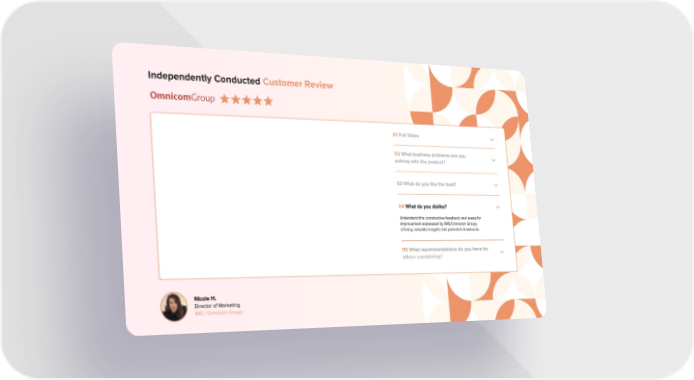 Independently Conducted Customer Review 01 Full Video 02What business problems are you solving with the product? 03What do you like the best? 04What do you dislike? Understand the constructive feedback and areas for improvement expressed by IMS/Omnicom Group, offering valuable insights into potential drawbacks. 05What recommendations do you have for others considering? Nicole H. Director of Marketing IMS / Omnicom Group