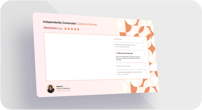 Independently Conducted Customer Review 01 Full Video 02What business problems are you solving with the product? 03What do you like the best? Discover the standout features and positive aspects of the product as highlighted by IMS/Omnicom Group in this section. 04What do you dislike? 05What recommendations do you have for others considering? Nicole H. Director of Marketing IMS / Omnicom Group