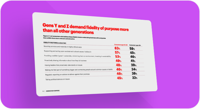 Gens Y and Z demand fidelity of purpose more than all other generations Figure 1: % of consumers who believe these fidelity factors make doing business with companies that exhibit them more relevant and attractive FIDELITY FACTORS (a select list) Consumers ages 18-39 Consumers ages 40+ Sourcing services and materials in highly ethical ways 63% 58% Supporting and acting upon societal and cultural causes I believe in 57% 45% Providing credible “green” credentials, minimizing harm on environment, investing in sustainability 53% 46% Proactively sharing information about how they do business 49% 41% Having leaders that proactively take stands on issues 48% 39% Making me feel part of something bigger and connecting people around common causes or beliefs 46% 34% Regularly reporting on actions to deliver against their promises 46% 38% Taking political stances on issues 45% 32% 5 | GENERATION P(URPOSE)