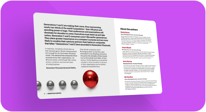 Generations Y and Z are making their move. Now representing About the authors 1 nearly two-thirds of the world’s population, their influence and Rachel Barton spending power is huge. Their preferences and expectations will Senior Managing Director, Accenture Strategy dominate for decades to come. Executives must stand up and take Rachel leads the Accenture Strategy Customer Insight & Growth notice. Generation Y and Z consumers aren’t like earlier generations: Strategy practice in Europe, Latin America and the United Kingdom. Working with some of the world’s largest companies, she advises They place greater importance on a company’s purpose and are more business leaders across multiple industries on how they can acquire likely to vocalize their opinions and turn their backs on companies and retain profitable customers to grow their market share. Rachel is based in London. that falter.2 Generations Y and Z have ascended to Generation P(urpose). Jürgen Morath In response, companies should step up How should companies react? Managing Director, Accenture Strategy their purpose game. Simply having purpose By bringing clarity to what they value Jürgen leads the Accenture Strategy Customer Insight & Growth Strategy isn’t enough for the Generation P(urpose) and believe in. By attracting consumers practice in Austria, Switzerland, Germany and Russia. He leads organizational growth strategies across a variety of industries and provides crowd. They demand that companies infuse not just by the strengths of their brands specialized expertise to the C-suite on how to leverage technologies purpose across their organizations, via but by the strength and fidelity of their to accelerate customer benefits. Jürgen is based in Kronberg. all touch points, and through their words, actions. And by applying a purpose-led Kevin Quiring actions, products, services and ways mindset to drive innovation to all parts Managing Director, Accenture Strategy of doing business. of their organizations and to achieve Kevin leads the Accenture Strategy Customer Insight & Growth Strategy Generation P(urpose) demands fidelity. sustained competitiveness. practice in North America. He advises organizations across a variety of industries in the design and development of customer strategies, and leads initiatives focused on driving profitable growth through customer acquisition, development and retention. Kevin is based in Minneapolis. Bill Theofilou Senior Managing Director, Accenture Strategy Bill leads the Accenture Strategy Customer Insight & Growth Strategy practice. He leads strategy and implementation engagements across a range of industries, specializing in restructuring companies for profitable growth, developing new go-to-market models and growth strategies, and aligning organizational and cost structures. Bill is based in Boston. 2 | GENERATION P(URPOSE)