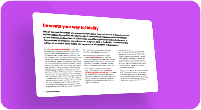 Innovate your way to fidelity One of the most important ways companies can prove their authenticity is through purpose- led innovation. Many think about innovation in terms of R&D initiatives and the introduction of new products and services. But innovation should be applied in a number of other ways to demonstrate a company’s commitment to purpose. Each of the fidelity factors presented in Figure 1, as well as many others, can be made real with purpose-led innovation. Consider environmental sustainability, a cause that It is a process of co creativity which promotes Customers now need to bring their own reusable more than half of Gen Y and Z embrace. Industries that value that will be shared in the long term.”9 cups—or buy one at the store. Ten months after were once not customer-centric are suddenly faced implementing this policy, Boston Tea Party had kept with learning the customer centricity ropes—the hard Other companies use purpose-led innovation 125,000 single-use cups from landfills. It also lost way. Utilities are one such industry in which purpose-led to create a sense of belonging for customers. £250K (US$327K) in sales. But the company had innovation in the area of environmental sustainability Tony’s Chocolonely, a Dutch confectionery company, factored this loss into its planning. As owner Sam has become their gateway to purpose and to a customer invites its consumers to be part of its purpose and Roberts put it, “We felt this was a financial loss we focus. No better example exists than with Enel, Europe’s rally behind its anti-slavery cause—and provides had to take and we want this to be a call to action 10 largest utility company, that took purpose-led innovation them information and opportunities to do just that. to other companies….We are 100% committed and there’s no going back.”11 head-on with it’s wholesale shift to a new positioning Gen Y and Z consumers are drawn to brands and strategy squarely aimed at consumers and that that put purpose before profits and stand for promises to deliver the fidelity of purpose consumers The bottom line is that virtually everything a company demand. At its core are two principles of sustainability something bigger than what they sell. Such brands does—and everything on which it can be judged and innovation, the latter of which is uniquely anchored take intentional risks. Their actions are driven by —can be innovated through the lens of purpose. in culture rather than technology. And they boldly put authenticity, not financial performance. Boston Tea This includes products and services, certainly, but 8 Party, an independent coffee chain in the United also supply chains, processes, organizational models, their commitment to their new Open Power purpose Kingdom, took the innovative action of banning out front: “Innovation must be cultural, rather than customer and employee experiences and more. technological, and that means being open to ideas single-use coffee cups. that come from both inside and outside the company. 7 | GENERATION P(URPOSE)