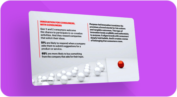INNOVATION FOR CONSUMERS, Purpose-led innovation translates the WITH CONSUMERS promises a brand stands for into actions Gen Y and Z consumers welcome and tangible outcomes. This type of the chance to participate in co-creation innovation lends credibility and authenticity activities. And they reward companies to purpose. It aligns brands with consumers’ that solicit their ideas. deeply held beliefs. And it creates a sense of belonging that consumers crave. 51% are likely to respond when a company asks them to submit suggestions for a product or service. 65% are more likely to buy something from the company that asks for their input. 8 | GENERATION P(URPOSE)