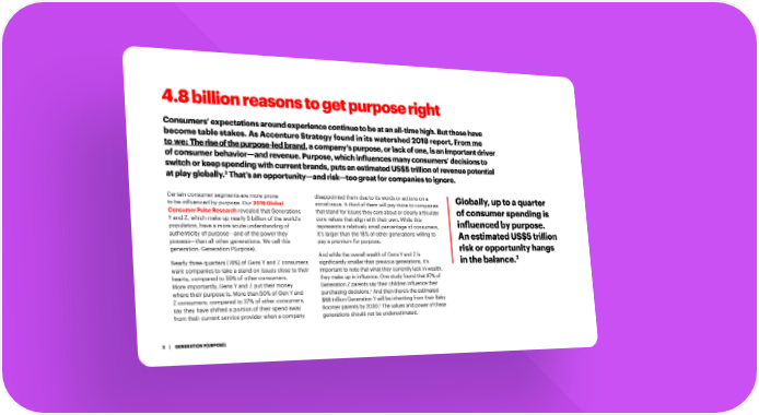 4.8 billion reasons to get purpose right Consumers’ expectations around experience continue to be at an all-time high. But those have become table stakes. As Accenture Strategy found in its watershed 2018 report, From me to we: The rise of the purpose-led brand, a company’s purpose, or lack of one, is an important driver of consumer behavior—and revenue. Purpose, which influences many consumers’ decisions to switch or keep spending with current brands, puts an estimated US$5 trillion of revenue potential at play globally.3 That’s an opportunity—and risk—too great for companies to ignore. Certain consumer segments are more prone disappointed them due to its words or actions on a Globally, up to a quarter to be influenced by purpose. Our 2019 Global social issue. A third of them will pay more to companies Consumer Pulse Research revealed that Generations that stand for issues they care about or clearly articulate of consumer spending is Y and Z, which make up nearly 5 billion of the world’s core values that align with their own. While this population, have a more acute understanding of represents a relatively small percentage of consumers, influenced by purpose. authenticity of purpose—and of the power they it’s larger than the 18% of other generations willing to An estimated US$5 trillion possess—than all other generations. We call this pay a premium for purpose. generation: Generation P(urpose). risk or opportunity hangs And while the overall wealth of Gens Y and Z is 3 Nearly three quarters (74%) of Gens Y and Z consumers significantly smaller than previous generations, it’s in the balance. want companies to take a stand on issues close to their important to note that what they currently lack in wealth, hearts, compared to 59% of other consumers. they make up in influence. One study found that 87% of More importantly, Gens Y and Z put their money Generation Z parents say their children influence their where their purpose is. More than 50% of Gen Y and purchasing decisions.4 And then there’s the estimated Z consumers, compared to 37% of other consumers, $68 trillion Generation Y will be inheriting from their Baby say they have shifted a portion of their spend away Boomer parents by 2030.5 The values and power of these from their current service provider when a company generations should not be underestimated. 3 | GENERATION P(URPOSE)
