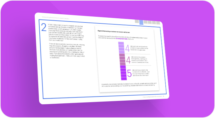 Embrace the generative AI era: Six adoption essentials In fact, independent economic research indicates that companies are significantly underinvesting in helping workers keep up with advances in AI, which require Figure 5: Reinventing a customer service job, task by task 11 2more cognitively complex and judgment-based tasks. Even domain experts who understand how to apply To assess how specific jobs will be reinvented with AI, an Accenture analysis decomposed data in the real world (a doctor interpreting health data, one customer service job into 13 component tasks. We found: for example) will need enough technical knowledge of how these models work to have confidence in using them as a “workmate.” There will also be entirely new roles to recruit, including tasks would continue to be performed linguistics experts, AI quality controllers, AI editors, primarily by humans, with low potential and prompt engineers. In areas where generative 4for automation or augmentation. AI shows most promise, companies should start by decomposing existing jobs into underlying bundles of tasks. Then assess the extent to which generative AI might affect each task — fully automated, augmented, tasks could be fully automated — or unaffected. such as gathering, classifying, and summarizing information on why a 4customer is contacting the company. tasks could be augmented to help humans work more effectively — such as using an AI summary to provide a 5rapid solution with a human touch. Importantly, new job tasks might also be needed to ensure the safe, accurate and responsible use of AI in customer service settings, such as providing unbiased information on products and pricing. A new era of generative AI for everyone | 16