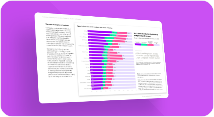 A look ahead at the fast-paced evolution of technology, regulation and business The scale of adoption in business Figure 3: Generative AI will transform work across industries Companies must reinvent work to find a path to generative AI value. Business Banking 54% 12% 24% 10% Work time distribution by industry leaders must lead the change, starting Insurance 48% 14% 26% 12% and potential AI impact now, in job redesign, task redesign and Based on their employment levels in the US in 2021 reskilling people. Ultimately, every role Software & Platforms 36% 21% 28% 15% in an enterprise has the potential to Lower potential for Capital markets 40% 14% 29% 18% Higher potential for Higher potential for augmentation or Non-language be reinvented, once today’s jobs are automation augmentation automation tasks decomposed into tasks that can be Energy 43% 9% 14% 34% automated or assisted and reimagined for a new future of human + machine work. Communications & Media 33% 13% 21% 33% Generative AI will disrupt work as Retail 34% 7% 12% 46% we know it today, introducing a new Industry Average 31% 9% 22% 38% 40% of working hours across dimension of human and AI collaboration industries can be impacted by in which most workers will have a “co- Health 28% 11% 33% 27% Large Language Models (LLMs) pilot,” radically changing how work is Public Service 30% 9% 35% 26% done and what work is done. Nearly every job will be impacted – some will Aerospace & Defense 26% 13% 20% 41% Why is this the case? Language tasks account for 62% of total worked time be eliminated, most will be transformed, in the US. Of the overall share of language tasks, 65% have high potential and many new jobs will be created. Automotive 30% 6% 13% 50% to be automated or augmented by LLMs. Organizations that take steps now to High Tech 26% 8% 16% 50% decompose jobs into tasks, and invest in training people to work differently, Travel 28% 6% 15% 50% alongside machines, will define new Utilities 27% 6% 15% 52% performance frontiers and have a big leg Source: Accenture Research based on analysis of Occupational up on less imaginative competitors. Life Sciences 25% 8% 17% 50% Information Network (O*NET), US Dept. of Labor; US Bureau of Labor Statistics. Industrial 26% 6% 14% 54% Notes: We manually identified 200 tasks related to language (out Consumer Goods & Services 24% 6% 13% 57% of 332 included in BLS), which were linked to industries using their share in each occupation and the occupations’ employment level Chemicals 24% 5% 14% 56% in each industry. Tasks with higher potential for automation can Natural Resources 20% 5% 11% 64% be transformed by LLMs with reduced involvement from a human worker. Tasks with higher potential for augmentation are those in 0% 10% 20% 30% 40% 50% 60% 70% 80% 90% 100% which LLMs would need more involvement from human workers. A new era of generative AI for everyone | 11