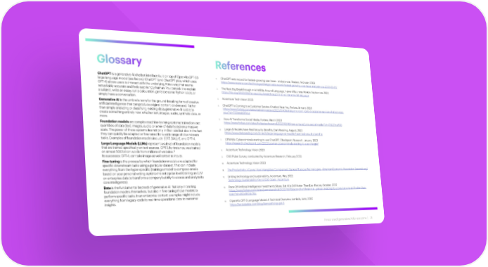 Glossary References ChatGPT is a generative AI chatbot interface built on top of OpenAI’s GPT-3.5 1. ChatGPT sets record for fastest-growing user base - analyst note, Reuters, February 2023 large language model (see below). ChatGPT (and ChatGPT plus, which uses https://www.reuters.com/technology/chatgpt-sets-record-fastest-growing-user-base-analyst-note-2023-02-01/ GPT-4) allows users to interact with the underlying AI in a way that seems 2. The Next Big Breakthrough in AI Will Be Around Language, Harvard Business Review, September, 2020 remarkably accurate and feels surprisingly human. You can ask it to explain https://hbr.org/2020/09/the-next-big-breakthrough-in-ai-will-be-around-language a subject, write an essay, run a calculation, generate some Python code, or simply have a conversation. 3. Accenture Tech Vision 2023 Generative AI is the umbrella term for the ground-breaking form of creative 4. ChatGPT Is Coming to a Customer Service Chatbot Near You, Forbes, January 2023 artificial intelligence that can produce original content on demand. Rather https://www.forbes.com/sites/rashishrivastava/2023/01/09/chatgpt-is-coming-to-a-customer-service-chatbot-near- than simply analyzing or classifying existing data, generative AI is able to you/?sh=730eeab97eca create something entirely new, whether text, images, audio, synthetic data, or more. 5. How AI Transforms Social Media, Forbes, March 2023 Foundation models are complex machine learning systems trained on vast https://www.forbes.com/sites/forbestechcouncil/2023/03/16/how-ai-transforms-social-media/?sh=739221ca1f30 quantities of data (text, images, audio, or a mix of data types) on a massive 6. Large AI Models have Real Security Benefits, Dark Reading, August, 2022 scale. The power of these systems lies not only in their size but also in the fact https://www.darkreading.com/dr-tech/large-language-ai-models-have-real-security-benefits they can quickly be adapted or fine-tuned for a wide range of downstream tasks. Examples of foundation models include BERT, DALL-E, and GPT-4. 7. OPWNAI: Cybercriminals starting to use ChatGPT, Checkpoint Research, January, 2023 Large Language Models (LLMs) represent a subset of foundation models https://research.checkpoint.com/2023/opwnai-cybercriminals-starting-to-use-chatgpt/ that are trained specifically on text sources. GPT-3, for instance, was trained 8. Accenture Technology Vision 2023 14 on almost 500 billion words from millions of websites. Its successor, GPT-4, can take image as well as text as inputs. 9. CXO Pulse Survey, conducted by Accenture Research, February 2023 Fine-tuning is the process by which foundation models are adapted for 10. Accenture Technology Vision 2023 specific downstream tasks using a particular dataset. That can include everything from the hyper-specific (training a model to compose emails 11. The Productivity J-Curve: How Intangibles Complement General Purpose Technologies - American Economic Association (aeaweb.org) based on your personal writing style) to the enterprise level (training an LLM on enterprise data to transform a company’s ability to access and analyze its 12. Uniting technology and sustainability, Accenture, May, 2022 core intelligence). Technology Sustainability Key to ESG Goals | Accenture Data is the fundamental bedrock of generative AI. Not only in training 13. Pace Of Artificial Intelligence Investments Slows, But AI Is Still Hotter Than Ever, Forbes, October, 2022 foundation models themselves, but also in fine-tuning those models to https://www.forbes.com//sites/joemckendrick/2022/10/15/pace-of-artificial-intelligence-investments-slows-but-ai-is-still-hotter-than- perform specific tasks. In an enterprise context, examples might include ever/?sh=853d8124c76c everything from legacy code to real-time operational data to customer insights. 14. OpenAI’s GPT-3 Language Model: A Technical Overview, Lambda, June, 2020 https://lambdalabs.com/blog/demystifying-gpt-3 A new era of generative AI for everyone | 21