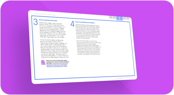 Embrace the generative AI era: Six adoption essentials Get your proprietary data ready Invest in a sustainable tech foundation Customizing foundation models will require Companies need to consider whether they have the 3access to domain-specific organizational data, 4right technical infrastructure, architecture, operating semantics, knowledge, and methodologies. In the model and governance structure to meet the high pre-generative AI era, companies could still get compute demands of LLMs and generative AI, while value from AI without having modernized their keeping a close eye on cost and sustainable energy data architecture and estate by taking a use-case consumption. They’ll need ways to assess the cost centric approach to AI. That’s no longer the case. and benefit of using these technologies versus other Foundation models need vast amounts of curated AI or analytical approaches that might be better data to learn and that makes solving the data suited to particular use cases, while also being challenge an urgent priority for every business. several times less expensive. Companies need a strategic and disciplined As the use of AI increases, so will the carbon approach to acquiring, growing, refining, emissions produced by the underlying infrastructure. safeguarding and deploying data. Specifically, they Companies need a robust green software need a modern enterprise data platform built on development framework that considers energy cloud with a trusted, reusable set of data products. efficiency and material emissions at all stages of the Because these platforms are cross-functional, with software development lifecycle. AI can also play a enterprise-grade analytics and data housed in cloud- broader role in making business more sustainable based warehouses or data lakes, data is able to break and achieving ESG goals. Of the companies we free from organizational silos and democratized for surveyed that successfully reduced emissions in 12 use across an organization. All business data can production and operations, 70% used AI to do it. then be analyzed together in one place or through a distributed computing strategy, such as a data mesh. Read more on the practices data-mature companies are using to maximize enterprise data value: A new dawn for dormant data: Unleash the intrinsic value of enterprise data with a strong digital core on cloud. A new era of generative AI for everyone | 17