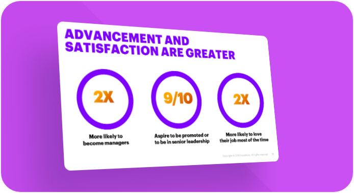 ADVANCEMENT AND SATISFACTION ARE GREATER v More likely to Aspire to be promoted or More likely to love become managers to be in senior leadership their job most of the time Copyright © 2018 Accenture. All rights reserved. 13
