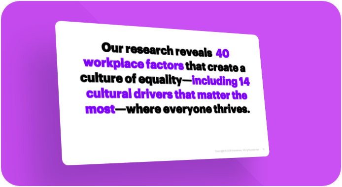 Our research reveals 40 workplace factors that createa culture of equality—including 14 cultural drivers that matter the most—where everyone thrives. Copyright © 2018 Accenture. All rights reserved. 11