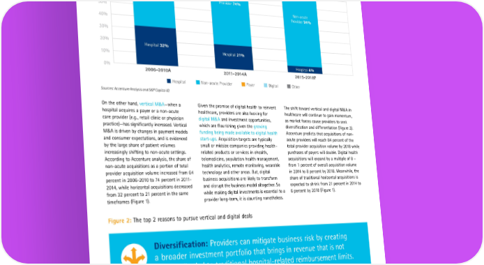 Figure 1: A s traditional hospital acquisitions shrink, non-acute and digital acquisitions are on the rise 100% Other 2% Other 3% Digital 1% Digital 1% Digital 8% 90% Payer 0% Payer 1% Payer 2% 80% 70% Non-acute 60% Provider 64% Non-acute Provider 74% 50% Non-acute Provider 84% 40% 30% 20% Hospital 32% 10% Hospital 21% 0% Hospital 6% 2006-2010A2011-2014A 2015-2018P Hospital Non-acute Provider Payer Digital Other Sources: Accenture Analysis and S&P Capital IQ On the other hand, vertical M&A—when a Given the promise of digital health to reinvent The shift toward vertical and digital M&A in hospital acquires a payer or a non-acute healthcare, providers are also looking for healthcare will continue to gain momentum, care provider (e.g., retail clinic or physician digital M&A and investment opportunities, as market forces cause providers to seek practice)—has significantly increased. Vertical which are flourishing given the growing diversification and differentiation (Figure 2). M&A is driven by changes in payment models funding being made available to digital health Accenture predicts that acquisitions of non- and consumer expectations, and is evidenced start-ups. Acquisition targets are typically acute providers will reach 84 percent of the by the large share of patient volumes small or midsize companies providing health- total provider acquisition volume by 2018 while increasingly shifting to non-acute settings. related products or services in ehealth, purchases of payers will double. Digital health According to Accenture analysis, the share of telemedicine, population health management, acquisitions will expand by a multiple of 8 – non-acute acquisitions as a portion of total health analytics, remote monitoring, wearable from 1 percent of overall acquisition volume provider acquisition volume increased from 64 technology and other areas. But, digital in 2014 to 8 percent by 2018. Meanwhile, the percent in 2006-2010 to 74 percent in 2011- business acquisitions are likely to transform share of traditional horizontal acquisitions is 2014, while horizontal acquisitions decreased and disrupt the business model altogether. So expected to shrink from 21 percent in 2014 to from 32 percent to 21 percent in the same while making digital investments is essential to a 6 percent by 2018 (Figure 1). timeframes (Figure 1). provider long-term, it is daunting nonetheless. Figure 2: T he top 2 reasons to pursue vertical and digital deals Diversification: Providers can mitigate business risk by creating a broader investment portfolio that brings in revenue that is not necessarily tied to traditional hospital-related reimbursement limits. Differentiation: Providers can establish new categories of services to increase their competitive advantage.