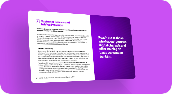 3 Customer Serviceand AdviceProvision The third major short-term impact of this pandemic will be rapid and potentially sustained changes in customers’ servicing preferences. Most banks will keep branches open as a vital service. However, customers are being told to minimize in-person interactions and stay home, so many will look to manage their Reach out to those financial life through apps, online banking, and greater reliance on their bank’s contact center. How should banks react to this pivot? In addition to the observations and who haven’t yetused recommendations immediately below, take a look at our detailed COVID-19 report on Responsive Customer Service in Times of Change. digital channels and Education andTraining offer training on Many people, like the elderly, don’t use apps or online banking because they are intimidated by the technology. Now is the time to educate and support customers who basic transaction have the capability to interact remotely. For those whohaven’t yet used digital channels, but have provided a cellphone number or email address, reach out and offer training on banking. basic transaction banking. Also, use it as an opportunity to connect and talk to these clients, many of whom are the most vulnerable in thecommunity. To scale up this interaction, branch and call center staff will themselves need to be trained, but this can be done quickly at a basic level.This is one of those areas where the perfect shouldn’t be the enemy of the good. Identifywho is avoiding online or digital banking and start by helping them masterbasic transactions like checking a balance. Also, think about adding lots of inline assistance to apps and online banking to help customers navigate to less-used features that they may now need to access. 17 COVID-19: Open letter to retail and commercial banking CEOs