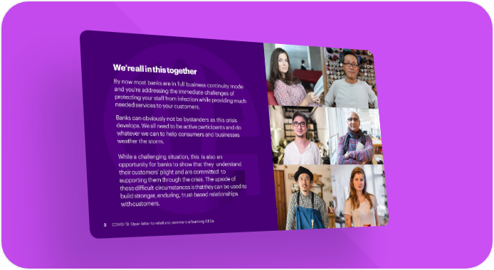 We’reallinthistogether By now most banks are in full business continuity mode and you're addressing the immediate challenges of protectingyourstafffrominfectionwhileprovidingmuch neededservicestoyourcustomers. Banks can obviously not be bystanders as this crisis develops.Weallneedtobeactiveparticipantsanddo whatever we can to help consumers and businesses weather the storm. While a challenging situation, this is also an opportunity for banks to show that they understand theircustomers’plightandarecommitted to supportingthemthroughthecrisis.Theupside of thesedifficult circumstancesis that they canbeusedto buildstronger,enduring, trust-based relationships withcustomers. 2 COVID-19: Open letter to retail and commercial banking CEOs