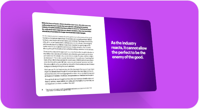 While the focus of banks’ efforts should be short-term, this crisis may very well accelerate many trends that were already reshaping the banking industry.It’squitepossiblethattherewillbenoreturnto“businessasusual”. So, while short-term responses are clearly necessary, they may (and often should)layafoundationforlonger-termbusinessmodelchanges. Astheindustryreacts,itcannotallowtheperfecttobetheenemyofthegood. Numerous Accenture clients have immediately announced paymentholidays forloans, resultingincallcentersbeingoverwhelmed. Thetriageofissueswas As the industry difficultforunder-trainedstaff,andtherewasalotof confusion.Butweagree withthecalculusofourclients:itwasmoreimportant to quickly signal the banks’ intent to be supportive partners and display empathy,thantoworry reacts,itcannotallow aboutgettingallthedetailssortedoutbeforesetting customers’ minds atease. Thesebanksadopted the approach to a crisis that is often taught to leaders in the perfect to be the themilitary:beclearabouttheintent,setadirection,getabasicplaninplace, get started on the mission, buy some time to revise the plan, and then adjust enemyofthegood. as necessary*. This is also a good description of the agile way of working that manyofourclientshaveadoptedinrecentyears.Whileit’stemptingtotreata crisislikethiswithawaterfall“plan,resource,andexecute”process,wethink thiscrisiscallsforafocusonshortsprintswithinthebroaderpurposeofalways tryingtodotherightthingforyourcustomers. We hope you find at least one issue in this document that you and your team might not already have thought of, and perhaps a few new ideas on how to addressthiscrisis.Wehaveaggregatedourideasintoachecklistthatappears attheendofthisletter.Asalways,weappreciateyourfeedbackandsupport. Throughitall,let’snotforgetthatthisisfirstandforemostahealthcrisis,and that our primary responsibility is to safeguard the health of our families, our colleaguesand,indeed,ourselves.Staywell! 3 * See Accenture’s report on the 10 practical steps leaders can takenow to steer their organization confidently through the crisis.