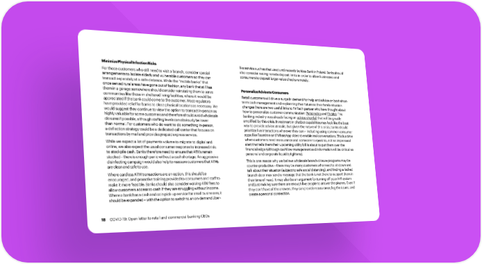 MinimizePhysicalInfectionRisks likeservicesuchasthatuseduntilrecentlybyIdeaBankinPoland.Banksshould For those customers who still need to visit a branch, consider special also consider raising remote deposit limits in order to allow businesses and arrangements to isolate elderly and vulnerable customers so they can consumerstodepositlarger-valuechecksremotely. transact separately at a safe distance. While the “mobile banks” that onceservedruralareashavegoneoutoffashion,anybankthatstillhas PersonalizeAdvicetoConsumers theminagaragesomewhereshouldconsiderreinstatingthemtoserve communities like those in sheltered living facilities, where it would be Retail customers will drive a surge in demand for help and advice on both short- appreciatedifthebankcouldcometothecustomer.Mostregulators term cash management and re-planning their future as their family situation haveprovidedreliefforbankstoclosephysicallocationsasnecessary.We changes(here are two useful links to FinTech partner who have thought about would suggest they continue to view the option to transact in-person as how to personalize customer communication: Personeticsand Flybits). The highlyvaluableforsomecustomersandthereforeshouldavoidwholesale banking industry was already facing an advice shortfallthat will be greatly closuresifpossible,althoughstaffinglevelscanobviouslybelower amplified by this crisis. Investment in chatbot capabilities may look like the best thannormal.Forcustomerswhodowanttodosomethingin-person, way to provide advice at scale, but given the nature of this crisis, banks should adeflectionstrategycouldbeadedicatedcallcenterthatfocuseson prioritize live interactions wherever they can – including using common consumer transactionsbymailandprovidesprepaidexpressservice. apps like Facetime and WhatsAppvideotoenablerealconversations.Thisisatime While we expect a lot of payments volume to migrate to digital and whencustomersneed reassurance and someone to speak to, not an impersonal online, we also expect the usual consumer response to increased risk: alert that tells them their upcoming utility bill is about to put them over the to stockpile cash. Banks therefore need to ensure that ATMs remain financial edge (although cashflow management and information will be critical as stocked–thereisenoughpanicwithoutacashshortage.Anaggressive personal and corporate liquiditytightens). disinfectingcampaignwouldalsohelptoreassurecustomersthatATMs This is one reason why we believe wholesale branch closure programs may be arecleanandsafetouse. counter-productive –there may be many customers who need to sit down and Where cardless ATM transactions are an option, this should be talk about their situation (subject to safe social distancing), and finding a locked encouraged, and proactive training provided to consumers and staff to branch door may send a message that the bank is not there to support them in make it more feasible. Banks should also consider waiving ATM fees to their time of need. It may also be an argument for turning off your IVR system allow customers access to cash if they are struggling without income. and just making sure there are enough live people to answer the phones. Even if Whereabankhasacashandcoinpick-upserviceforsmallbusinesses,it theydon’thavealltheanswers,theycanprovidereassurance,logtheissues,and shouldbeexpanded–withtheoptiontoswitchtoanon-demandUber- create apersonal connection. 18 COVID-19: Open letter to retail and commercial banking CEOs