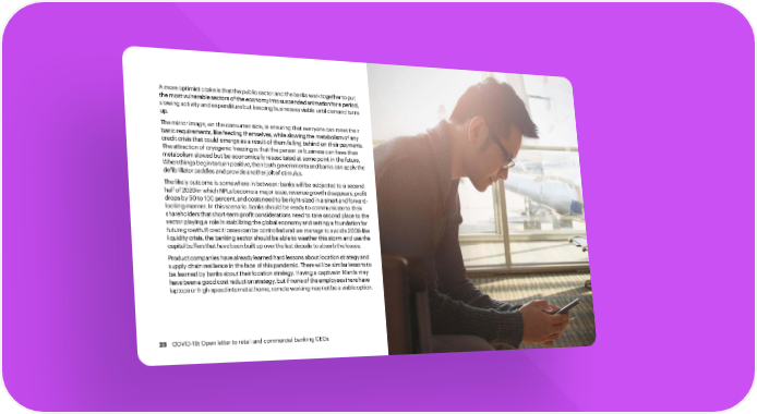 Amoreoptimistictakeisthatthepublicsectorandthebanksworktogethertoput themostvulnerablesectorsoftheeconomyintosuspendedanimationforaperiod, slowing activity and expenditure but keeping businesses viable until demand turns up. The mirror image, on the consumer side, is ensuring that everyone can meet their basic requirements, like feeding themselves, while slowing the metabolism of any credit crisis that could emerge as a result of them falling behind on their payments. The attraction of cryogenic freezing is that the person or business can have their metabolism slowed but be economically resuscitated at some point in the future. Whenthingsbegintoturnpositive,thenbothgovernmentsandbankscanapplythe defibrillatorpaddlesandprovideanotherjoltofstimulus. The likely outcome is somewhere in between: banks will be subjected to a second halfof2020inwhichNPLsbecomeamajorissue,revenuegrowthdisappears,profit dropsby50to100percent,andcostsneedtoberight-sizedinasmartandforward- looking manner. In this scenario, banks should be ready to communicate to their shareholders that short-term profit considerations need to take second place to the sector playing a role in stabilizing the global economy and setting a foundation for futuregrowth.Ifcreditlossescanbecontrolledandwemanagetoavoida2008-like liquidity crisis, the banking sector should be able to weather this storm and use the capitalbuffersthathavebeenbuiltupoverthelastdecadetoabsorbthelosses. Product companies have already learned hard lessons about location strategy and supply chain resilience in the face of this pandemic. There will be similar lessons to be learned by banks about their location strategy. Having a captive in Manila may havebeenagoodcostreductionstrategy,butifnoneoftheemployeestherehave laptopsorhigh-speedinternetathome,remoteworkingmaynotbeaviableoption. 23 COVID-19: Open letter to retail and commercial banking CEOs