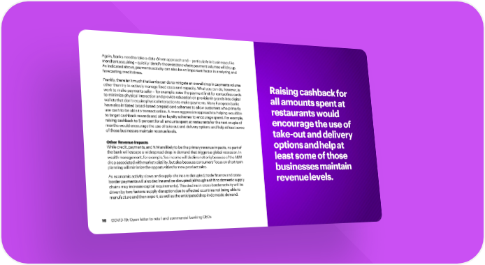 Again, banks need to take a data-driven approach and – particularly in businesses like merchantacquiring–quicklyidentifythosesectorswherepaymentvolumeswilldryup. As indicated above, payments activity can also be an important factor in analyzing and forecasting creditstress. Frankly,thereisn’tmuchthatbankscandotomitigateanoveralldropinpaymentsvolume other than try to actively manage fixed costs and capacity. What you can do, however, is Raising cashback for work to make payments safer – for example, raise the payment limit for contactless cards to minimize physical interaction and provide education on provisioning cards into digital all amounts spent at wallets that don’t require physical interaction to make payments. Many European banks have also initiated broad-based prepaid card schemes to allow customers who primarily use cash to be able to transact online. A more aggressive approach to helping would be restaurants would to target cashback rewards and other loyalty schemes to encourage spend. For example, raising cashback to 5 percent for all amounts spent at restaurants for the next couple of encourage the use of months would encourage the use of take-out and delivery options and help at least some ofthosebusinessesmaintainrevenuelevels. take-out and delivery Other RevenueImpacts optionsandhelpat Whilecredit,payments,andNIMarelikelytobetheprimaryrevenueimpacts,nopartof the bank will escape a widespread drop in demand that triggers a global recession. In wealthmanagement,forexample,feeincomewilldeclinenotonlybecauseoftheAUM least some of those dropassociatedwithmarketvolatility,butalsobecauseconsumers’focusonshort-term planningwillminimizetheopportunitiesfornewproductsales. businesses maintain As economic activity slows and supply chains are disrupted, trade finance and cross- borderpaymentswillalsodeclineandbedisrupted(althoughashifttodomesticsupply revenuelevels. chains may increase capital requirements). This decline in cross-border activity will be driven by two factors: supply disruption due to affected countries not being able to manufactureandthenexport,aswellastheanticipateddropindomesticdemand. 16 COVID-19: Open letter to retail and commercial banking CEOs