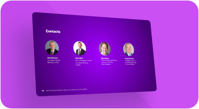 Contacts Alan McIntyre Julian Skan Mike Abbott Fergus Gordon Accenture Global Senior Managing Director – Senior Managing Director – Managing Director – Banking Leader Accenture Banking, Accenture Banking, Accenture Banking, Europe North America Growth Markets 30 COVID-19: Open letter to retail and commercial banking CEOs