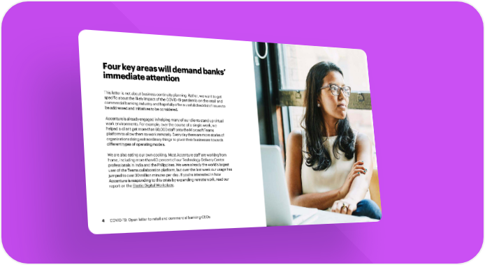 Fourkeyareaswilldemandbanks’ immediateattention This letter is not about business continuity planning. Rather, we want to get specific about the likely impact of the COVID-19 pandemic on the retail and commercialbankingindustryandhopefullyofferausefulchecklistofissuesto beaddressedandinitiativestobeconsidered. Accentureisalreadyengagedinhelpingmanyofourclientsstandupvirtual work environments. For example, over the course of a single week, we helped a client get morethan60,000staffontotheMicrosoftTeams platformtoallowthemtoworkremotely.Everydaytherearemorestoriesof organizationsdoing extraordinary things to pivot their businesses towards different types of operatingmodels. We are also eating our own cooking. Most Accenture staff are working from home, including more than 60 percent of our Technology Delivery Center professionals in India and the Philippines. We were already the world’s largest user of the Teams collaboration platform, but over the last week our usage has jumpedtoover30million minutes per day. If you’re interested in how Accenture is responding to this crisisby expanding remote work, read our report on the Elastic Digital Workplace. 4 COVID-19: Open letter to retail and commercial banking CEOs