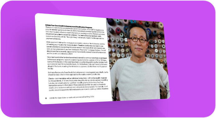 InitiateYourOwnCreditForbearanceandModificationPrograms There is no need to be constrained by government action or to wait for regulators to provide detailed guidance. In the US, banks have already received guidance from the OCCthat“prudenteffortstomodifythetermsonexistingloansforaffectedcustomers should not be subject to examiner criticism.” So, banks should proactively notify customers that they will do “the right thing” and adopt a highly flexible approach to paymentschedules. While payment holidays for mortgages are helpful, outside of North America and the UKrentingyourhouseisfarmoreprevalent.Therefore,banksmayalsoneed topay special attention to supporting the rental sector in two ways: short-term loans to pay rent, and an extension of payment holidays to “buy-to-let” mortgage holders. This will also ensure that economic support is not inadvertently skewed towards homeowners andthosewhoarerelativelywelloff. Manybanksandotherlendershavealreadystartedtocommunicatethesebroad-based forbearance programs, typically suspending payments for a period of 90 to 120 days. Some of the leaders in this wave have been crowdlending platforms like October (with apresenceinhard-hitmarketslikeSpain,theNetherlands,ItalyandFrance)whichwere aheadofthebanksinaskingtheirinvestorstoapproveablanketthree-monthpayment holiday. Butmanylendersalsohavetheabilitytointerveneinmoretargetedways.Ideally,banks shouldbedata-drivenintheirapproachtothisrapidlyevolvingcreditcrisis. Clients – commercial as well as individual consumers – will not be equally impacted by this pandemic. It follows that lenders should be doing not only sectoral modelling but also individual customer cashflow modelling (particularly where they have transaction account information). These analyses can then be used to proactively reach out to customers with tailored, relevant solution proposals. For example, it will quicklybecomeapparentwhichrestaurantscanmovetoapick-up/deliverybusiness 8 COVID-19: Open letter to retail and commercial banking CEOs