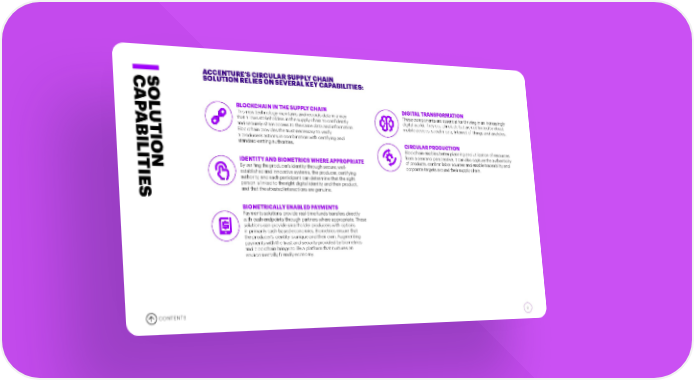 ACCENTURE’S CIRCULAR SUPPLY CHAIN C SOL SOLUTION RELIES ON SEVERAL KEY CAPABILITIES: AP BLOCKCHAIN IN THE SUPPLY CHAIN DIGITAL TRANSFORMATION ABILITIEUTION This new technology maintains and records data in a way These components are essential for thriving in an increasingly that allows stakeholders in the supply chain to confidently digital world. They could include but are not limited to cloud, and securely share access to the same data and information. mobile devices, social media, Internet of Things and analytics. Blockchain provides the trust necessary to verify a producer’s actions in combination with certifying and standard-setting authorities. CIRCULAR PRODUCTION Blockchain enables better planning and utilization of resources IDENTITY AND BIOMETRICS WHERE APPROPRIATE from a demand perspective. It can also capture the authenticity of products, confirm labor sources and enable traceability and By verifing the producer’s identity through secure, well- corporate targets around their supply chain. established and innovative systems, the producer, certifying authority, and each participant can determine that the right S person is linked to the right digital identity and their product, and that the attested interactions are genuine. BIOMETRICALLY ENABLED PAYMENTS Payments solutions provide real-time funds transfers directly with cash endpoints through partners where appropriate. These solutions can provide smallholder producers with options in primarily cash-based economies. Biometrics ensure that the producer’s identity is unique and their own. Augmenting payments with the trust and security provided by biometrics and blockchain brings to life a platform that nurtures an environmentally friendly economy. CONTENTS 8
