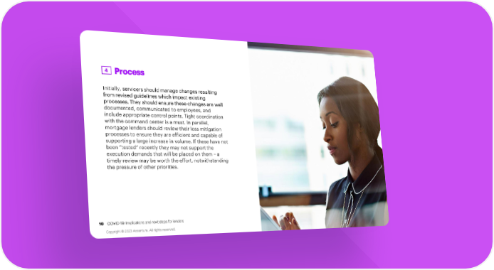4 Process Initially, servicers should manage changes resulting from revised guidelines which impact existing processes. They should ensure these changes are well documented, communicated to employees, and include appropriate control points. Tight coordination with the command center is a must. In parallel, mortgage lenders should review their loss mitigation processes to ensure they are efficient and capable of supporting a large increase in volume. If these have not been “tested” recently they may not support the execution demands that will be placed on them – a timely review may be worth the effort, notwithstanding the pressure of other priorities. 10 COVID-19: Implications and next steps for lenders