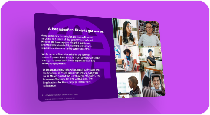 A bad situation, likely to get worse. Many consumer households are facing financial hardship as a result of the coronavirus outbreak. Millions are now experiencing the realities of unemployment and millions more are likely to experience the same in the coming months. While some will receive relief in the form of unemployment insurance, in most cases it will not be enough to cover basic living expenses including mortgage payments. To lessen the blow to families, small businesses and the financial services industry in the US, Congress on 27 March passed the Coronavirus Aid, Relief, and Economic Security Act (the CARES Act). The implications for the mortgage industry are substantial. 2 COVID-19: Implications and next steps for lenders