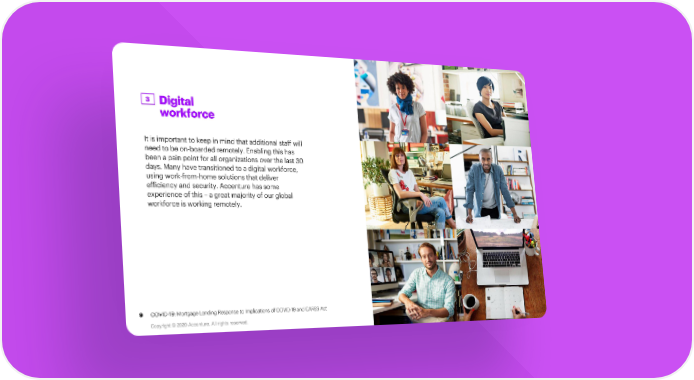 3 Digital workforce It is important to keep in mind that additional staff will need to be on-boarded remotely. Enabling this has been a pain point for all organizations over the last 30 days. Many have transitioned to a digital workforce, using work-from-home solutions that deliver efficiency and security. Accenture has some experience of this –a great majority of our global workforce is working remotely. 9 COVID-19: Mortgage Lending Response to Implications of COVID-19 and CARES Act