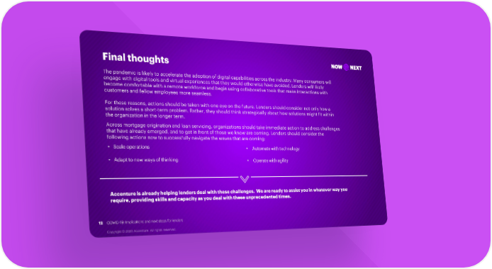 Final thoughts NOW NEXT The pandemic is likely to accelerate the adoption of digital capabilities across the industry. Many consumers will engagewith digital tools and virtual experiences that they would otherwise have avoided. Lenders will likely become comfortable with a remote workforce and begin using collaborative tools that make interactions with customers and fellow employees more seamless. For these reasons, actions should be taken with one eye on the future. Lenders should consider not only how a solution solves a short-term problem. Rather, they should think strategically about how solutions might fit within the organization in the longer term. Across mortgage origination and loan servicing, organizations should take immediate action to address challenges that have already emerged, and to get in front of those we know are coming. Lenders should consider the following actions now to successfully navigate the waves that are coming: • Scale operations • Automate with technology • Adapt to new ways of thinking • Operate with agility Accenture is already helping lenders deal with these challenges. We are ready to assist you in whatever way you require, providing skills and capacity as you deal with these unprecedented times. 12 COVID-19: Implications and next steps for lenders