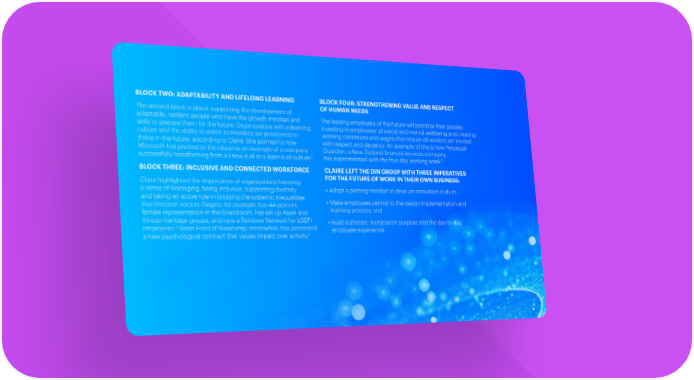 BLOCK TWO: ADAPTABILITY AND LIFELONG LEARNING BLOCK FOUR: STRENGTHENING VALUE AND RESPECT OF HUMAN NEEDS The second block is about supporting the development of adaptable, resilient people who have the growth mindset and The leading employers of the future will prioritize their people, skills to prepare them for the future. Organizations with a learning investing in employees’ physical and mental wellbeing and creating culture and the ability to admit to mistakes are positioned to working conditions and wages that ensure all workers are treated thrive in the future, according to Claire. She pointed to how with respect and decency. An example of this is how Perpetual Microsoft has pivoted to the cloud as an example of a company Guardian, a New Zealand financial services company, 2 5 successfully transforming from a know-it-all to a learn-it-all culture. has experimented with the four-day working week. BLOCK THREE: INCLUSIVE AND CONNECTED WORKFORCE CLAIRE LEFT THE DIN GROUP WITH THREE IMPERATIVES FOR THE FUTURE OF WORK IN THEIR OWN BUSINESS: Claire highlighted the importance of organizations fostering a sense of belonging, being inclusive, supporting diversity • Adopt a piloting mindset to drive an innovation culture; and taking an active role in bridging the systemic inequalities that threaten society. Diageo, for example, has 44 percent • Make employees central to the design,implementation and female representation in the boardroom, has set up Asian and learning process; and African heritage groups, and runs a Rainbow Network for LGBT+ • Build authentic, transparent purpose into the day-to-day 3 employees. Jason Fried of Basecamp, meanwhile, has pioneered employee experience. 4 a new psychological contract that values impact over activity. AN INNOVATION AGENDA FOR THE COVID-19 ERA 10