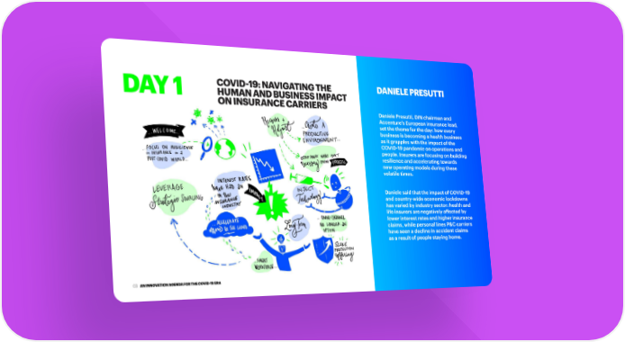 COVID-19: NAVIGATING THE DANIELE PRESUTTI DAY 1 HUMAN AND BUSINESS IMPACT ON INSURANCE CARRIERS Daniele Presutti, DIN chairman and Accenture‘s European insurance lead, set the theme for the day: how every business is becoming a health business as it grapples with the impact of the COVID-19 pandemic on operations and people. Insurers are focusing on building resilience and accelerating towards new operating models during these volatile times. Daniele said that the impact of COVID-19 and country-wide economic lockdowns has varied by industry sector: health and life insurers are negatively affected by lower interest rates and higher insurance claims, while personal lines P&C carriers have seen a decline in accident claims as a result of people staying home. AN INNOVATION AGENDA FOR THE COVID-19 ERA 03