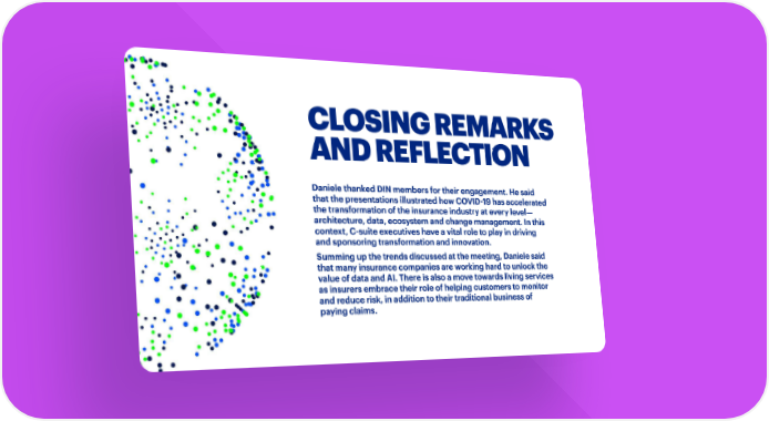 CLOSING REMARKS AND REFLECTION Daniele thanked DIN members for their engagement. He said that the presentations illustrated how COVID-19 has accelerated the transformation of the insurance industry at every level— architecture, data, ecosystem and change management. In this context, C-suite executives have a vital role to play in driving and sponsoring transformation and innovation. Summing up the trends discussed at the meeting, Daniele said that many insurance companies are working hard to unlock the value of data and AI. There is also a move towards living services as insurers embrace their role of helping customers to monitor and reduce risk, in addition to their traditional business of paying claims. AN INNOVATION AGENDA FOR THE COVID-19 ERA 24