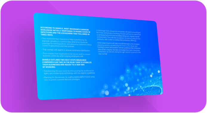 ACCORDING TO DANIELE, MOST INSURANCE CARRIERS In the longer term, insurance companies will need to reconfigure WORLDWIDE INITIALLY RESPONDED TO RISING COVID-19 for a new normal way of working. Insurers will have no option but INFECTIONS AND THE LOCKDOWNS THAT FOLLOWED IN to embrace full omni-channel relationships and digital channel THREE WAYS: orchestration. They will also accelerate the restructuring of their products, with a view to scaling their protection offerings. • They mobilized their resources to help customers by, for example, donating to communities, extending insurance Other steps insurers will take include leveraging new strategic coverage for existing policies and educating customers about sourcing options, accelerating the move to the cloud, and COVID-19 prevention and their policies. building a smart and resilient remote workforce that embraces data-driven insights. Daniele concluded that many insurance • They worked with agents to ensure continuous distribution. companies are already taking the right actions to prevail in the • They enabled their organizations for remote work to ensure ‘new normal’. business continuity while keeping employees safe. DANIELE OUTLINED TWO NEXT STEPS INSURANCE COMPANIES CAN TAKE IN THE NEAR TERM TO STABILIZE THEIR BUSINESSES AND ADJUST TO A NEW WAY OF WORKING: • Transforming the cost curve by restructuring the workforce for agility and modernizing technology with new digital capabilities. • Planning for the recovery by scaling digital platforms and using data to power customer lifecycle strategies. AN INNOVATION AGENDA FOR THE COVID-19 ERA 04