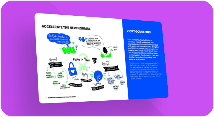 ACCELERATE THE NEW NORMAL VICKY GODOLPHIN Vicky Godolphin, head of digital at Accenture Ireland, spoke about how organizations and people have responded with agility and innovation to the disruption the COVID-19 pandemic has brought into our lives. One simply needs to look at the use of robots to disinfect buildings faster and more safely than humans and the way distillers have pivoted to making hand sanitizer as examples. Insurance, too, needs to innovate in today’s challenging landscape. While the industry has been resilient in the face of previous economic and environmental shocks, the pace and scale of change it faces today is massive. To adjust to the new reality, insurance companies should consider a ‘respond and renew’ strategy. AN INNOVATION AGENDA FOR THE COVID-19 ERA 14