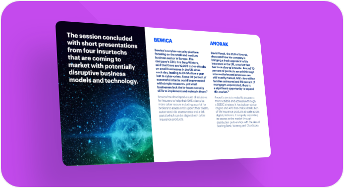 The session concluded BEWICA ANORAK with short presentations Bewica is a cyber-security platform David Vanek, the CEO of Anorak, from four insurtechs focusing on the small and medium discussed how his company is business sector in Europe. The bringing a fresh approach to life that are coming to company’s CEO, Eva Berg-Winters, insurance in the UK, a market that said that there are 10,000 cyber-attacks has been slow to innovate. Around 70 market with potentially on small businesses in the UK alone percent of products are sold through each day, leading to £4.5 billion a year intermediaries and processes are disruptive business lost to cyber-crime. Some 80 percent of still heavily manual. With nine million models and technology. successful attacks could be prevented families uninsured and 50 percent of with simple measures, yet small mortgages unprotected, there is businesses lack the in-house security a significant opportunity to expand 11 12 skills to implement and maintain these. this market. Bewica has developed a suite of solutions Anorak’s aim is to make life insurance for insurers to help their SME clients be more scalable and accessible through more cyber secure including a portal for a B2B2C strategy. It has built an advice brokers to assess and support their clients, engine and APIs that enable distribution automated risk assessments and a risk of life insurance products at scale across portal which can be aligned with cyber digital platforms. It is rapidly expanding insurance products. its access to the market through distribution partnerships with the likes of Starling Bank, Nutmeg and ClearScore. AN INNOVATION AGENDA FOR THE COVID-19 ERA 22