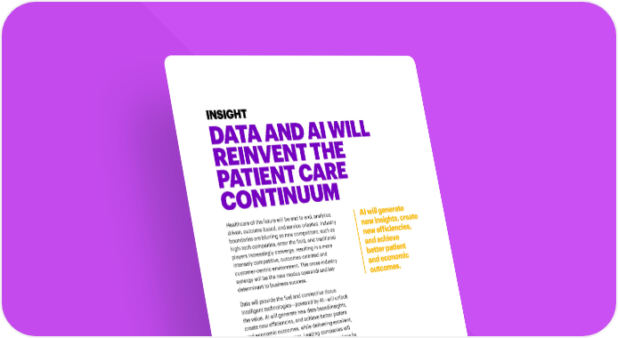 INSIGHT DATA AND AI WILL REINVENT THE PATIENT CARE CONTINUUM Healthcare of the future will be end to end, analytics AI will generate driven, outcome based, and service oriented. Industry new insights, create boundaries are blurring as new competitors, such as new efficiencies, high-tech companies, enter the field, and traditional players increasingly converge, resulting in a more and achieve intensely competitive, outcomes-oriented and better patient customer-centric environment. This cross-industry and economic synergy will be the new modus operandi and key outcomes. determinant to business success. Data will provide the fuel and connective tissue. Intelligent technologies—powered by AI—will unlock the value. AI will generate new data-based insights, create new efficiencies, and achieve better patient and economic outcomes, while delivering excellent, personalized experiences. Leading companies will transform treatment, care, and business operations by putting data and AI at the core of everything they do. INTELLIGENT HEALTHCARE THE RACE TO REINVENT HEALTHCARE 5