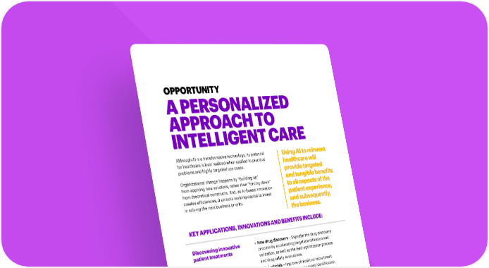 OPPORTUNITY A PERSONALIZED APPROACH TO INTELLIGENT CARE Although AI is a transformative technology, its potential Using AI to reinvent for healthcare is best realized when applied to practical healthcare will problems and highly targeted use cases. provide targeted Organizational change happens by “building up” and tangible benefits from applying new solutions, rather than “forcing down” to all aspects of the from theoretical constructs. And, as AI-based innovation patient experience, creates efficiencies, it unlocks working capital to invest in solving the next business priority. and subsequently, the business. KEY APPLICATIONS, INNOVATIONS AND BENEFITS INCLUDE: Discovering innovative • New drug discovery – Expedite the drug-discovery patient treatments process by accelerating target identification and validation, as well as the lead-optimization process and drug safety evaluations. • Clinical trials – Improve clinical trial recruitment, patient identification, adverse event identification, trial management, and approval processes via adaptive trials and real-world evidence (RWE). • Genomics – Reduce the time and cost to develop new treatments and drugs by efficiently analyzing complex genomic datasets and predicting what will happen within a cell when DNA is altered by genetic variation. INTELLIGENT HEALTHCARE THE RACE TO REINVENT HEALTHCARE 6