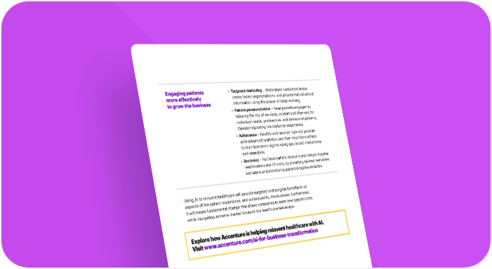 Engaging patients • Targeted marketing – Understand customers better, more effectively create better segmentations, and provide individualized to grow the business information using the power of deep learning. • Patient personalization – Keep patients engaged by tailoring the mix of services, content and channels for individual needs, preferences, and behavioral patterns, thereby improving the customer experience. • Adherence – Identify and monitor high-risk patients with advanced analytics, and then help them adhere to their treatment regime using app-based interactions and wearables. • Recovery – Facilitate patient recovery and reduce hospital readmissions and ER visits, by providing tailored reminders and alerts and monitoring patient progress remotely. Using AI to reinvent healthcare will provide targeted and tangible benefits to all aspects of the patient experience, and subsequently, the business. Furthermore, it will create fundamental change that allows companies to seize new opportunities while navigating extreme market forces in the healthcare landscape. Explore how Accenture is helping reinvent healthcare with AI. Visit www.accenture.com/ai-for-business-transformation INTELLIGENT HEALTHCARE THE RACE TO REINVENT HEALTHCARE 8