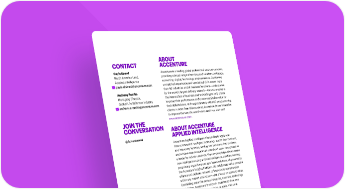 CONTACT ABOUT ACCENTURE Gayle Sirard Accenture is a leading global professional services company, North America Lead, providing a broad range of services and solutions in strategy, Applied Intelligence consulting, digital, technology and operations. Combining [email protected] unmatched experience and specialized skills across more than 40 industries and all business functions—underpinned Anthony Romito by the world’s largest delivery network—Accenture works at Managing Director, the intersection of business and technology to help clients Global Life Sciences Industry improve their performance and create sustainable value for [email protected] their stakeholders. With approximately 449,000 people serving clients in more than 120 countries, Accenture drives innovation to improve the way the world works and lives. Visit us at JOIN THE www.accenture.com. CONVERSATION ABOUT ACCENTURE @AccentureAI APPLIED INTELLIGENCE Accenture Applied Intelligence helps clients apply new data science and intelligent technology across their business, and into every function, so they can transform their business and achieve new outcomes at speed and scale. Recognized as a leader by industry analysts, the company helps clients create new intelligence using artificial intelligence, machine learning, proprietary algorithms and app-based solutions, all powered by the Accenture Insights Platform. We collaborate with a powerful alliance and delivery network to help clients operationalize within any market and industry with a focus on speed to value. Combining expertise across industries, analytics, technology and design, Accenture is uniquely qualified to drive new business outcomes with precision, at scale. Visit us at www.accenture.com/appliedintelligence. This document makes descriptive reference to trademarks that may be owned by others. The use of such trademarks herein is not an assertion of ownership of such trademarks by Accenture and is not intended to represent Copyright © 2018 Accenture. or imply the existence of an association between Accenture and the lawful All rights reserved. owners of such trademarks. Accenture, its logo, and High This document is produced by consultants at Accenture as general Performance Delivered are guidance. It is not intended to provide specific advice on your registered trademarks circumstances. If you require advice or further details on any matters of Accenture. referred to, please contact your Accenture representative.